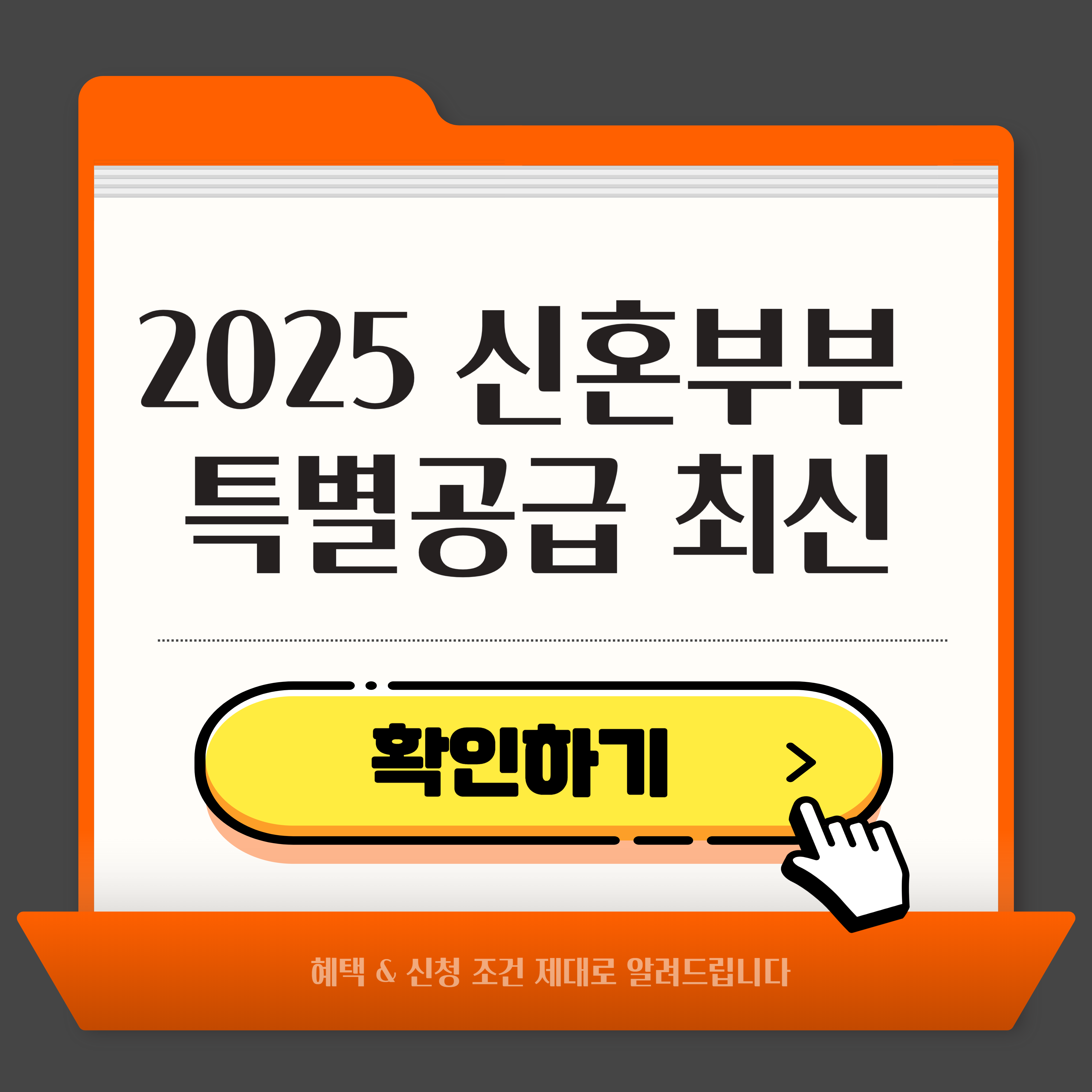 신혼부부 특별공급은 결혼 초기 가정의 안정적인 주거 마련을 돕기 위해 마련된 청약 제도입니다. 혼인 기간, 자녀 보유 여부, 무주택 세대 조건 등을 충족하면 일반 청약 경쟁보다 훨씬 유리하게 내 집 마련 기회를 얻을 수 있습니다. 2025년 신혼부부 특별공급의 자격 요건, 신청 절차, 소득·자산 기준, 공급 비율과 당첨 전략까지 미리 숙지해 신청 타이밍을 놓치지 마시고 온라인 신청으로 간단히 참여할 수 있으니 알아보시기 바랍니다. 바로 확인하고 싶으시다면 아래 버튼을 통해 확인해 주시면 됩니다.