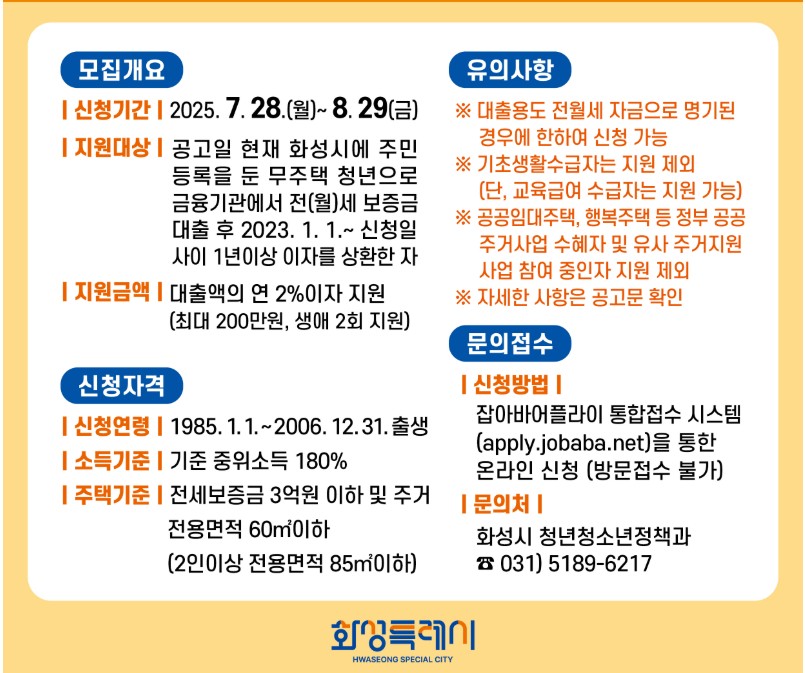 2025년 화성시 청년 전·월세 보증금 대출이자 지원사업 하반기 신청 안내