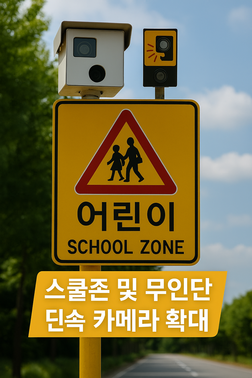어린이 보호구역(스쿨존)에서는 무인 단속 카메라가 확대 설치 됩니다. 차량 속도, 신호위반, 보행자 보호 여부 등을 24시간 감시하며, 특히 등하교 시간 외에도 상시 단속이 적용됩니다.